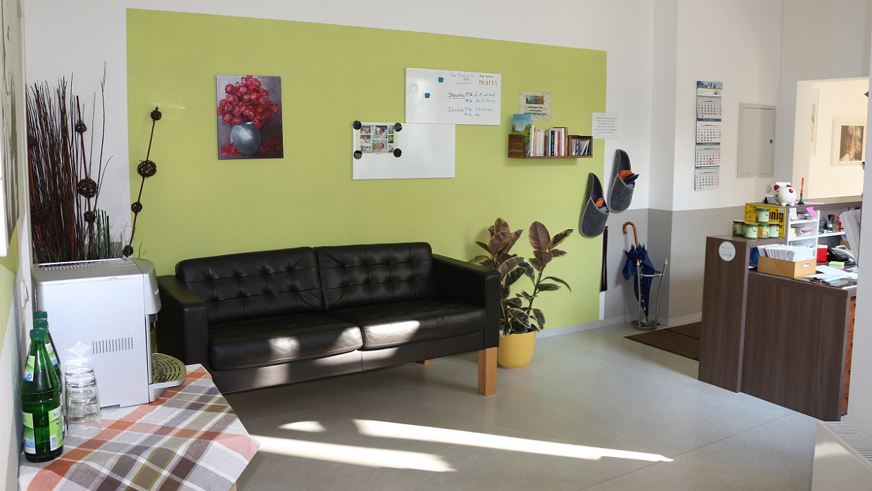 Die Praxis befindet sich im 3. Obergeschoss eines Geschäftshauses inmitten der Erfurter Altstadt - in der Fußgängerzone zwischen Fischmarkt und Anger. Auf 140 qm befinden sich 3 Therapie-Behandlungsräume, 1 Sportraum ( ausgestattet mit Kletterwand, Sprossenwand und Krafttrainingsgerät), ein großzügiger Wartebereich mit Kaffee und Getränken und eine integrierte Ernährungspraxis. Dies bietet genügend Platz, um uns den Anliegen unserer Patienten zu widmen. Aufgrund der Bestellpraxis erleben Sie keine nennenswerten Wartezeiten.
